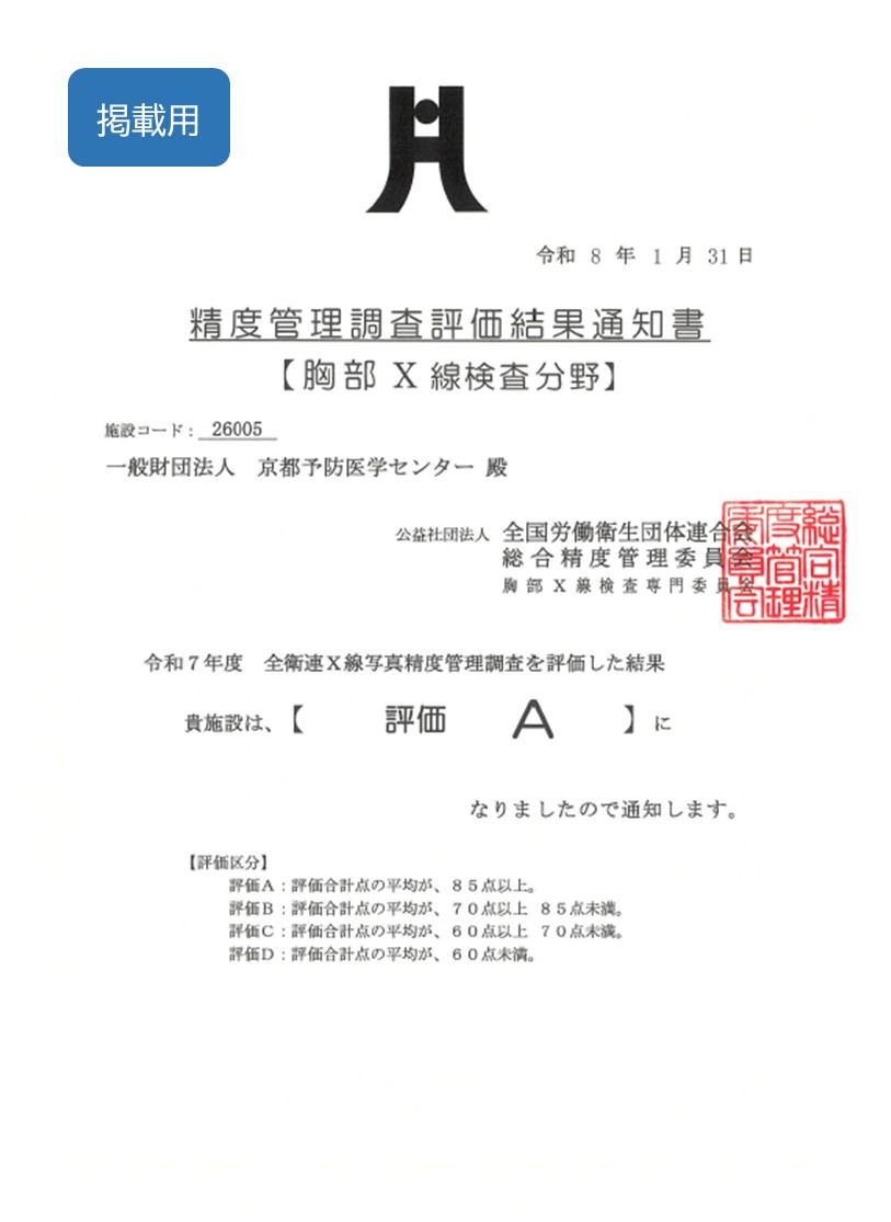 令和7年度全国労働衛生団体連合会精度管理調査の胸部X線検査分野においてA評価を取得しました。