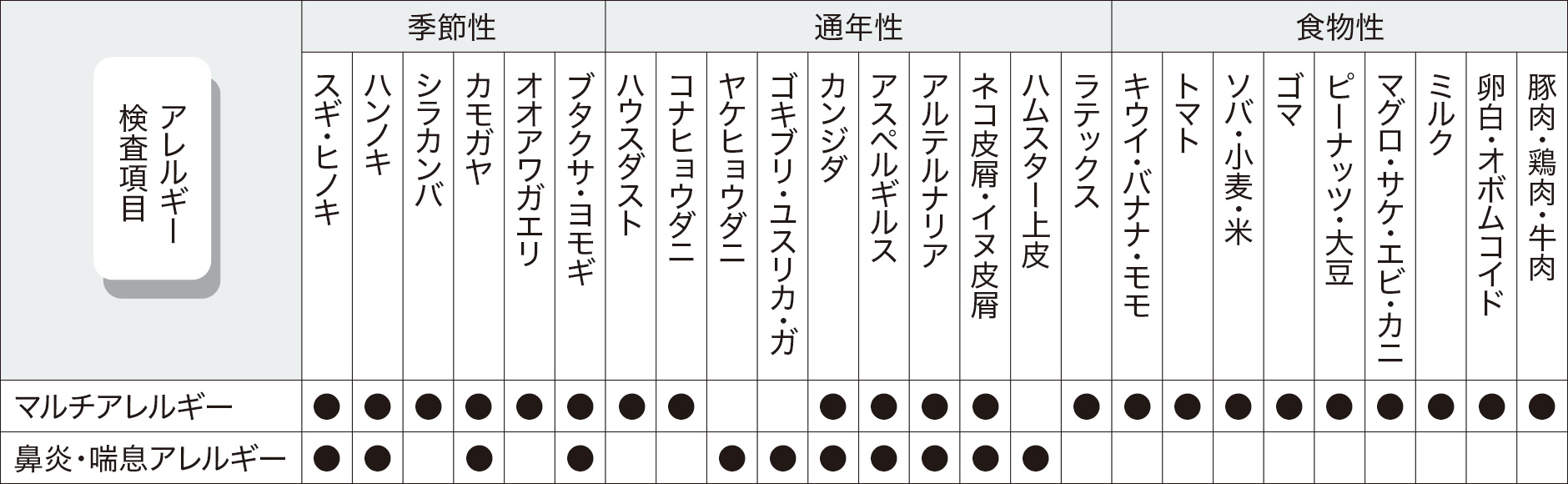 鼻炎や喘息の原因となる物質を調べます。原因がわかることで、対処方法を探すことができます。 | 13,200円 |